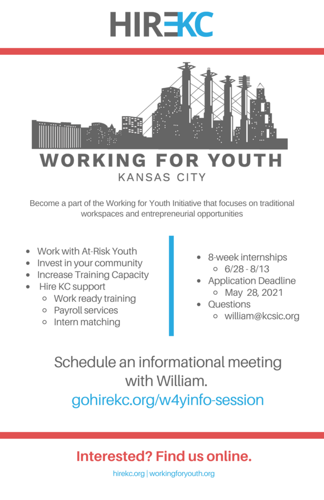 Working For Youth is an evidence-based model aimed at changing the trajectory of vulnerable teens living in underserved communities by expanding youth employment opportunities in Kansas City. Hire KC, and KC Common Good (KCCG) are joining forces to grow the city’s capacity to train, coach and employ 250-300 youth this summer by offering them an 8 week paid internship that will pay them a $1,000 stipend. Also, students will have a week of training at Hire KC’s Work Ready Institute training seminar.